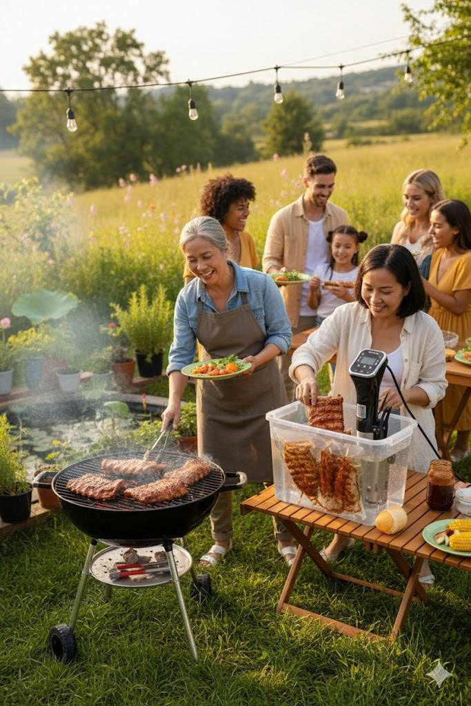 Bức ảnh minh họa cho thấy một buổi tiệc ngoài trời ấm cúng: thịt sườn được nấu sous vide chuẩn bị sẵn, sau đó đem lên vỉ nướng để hoàn thiện. Kết quả: thịt mềm – mọng – chín đều – giữ vị, đúng chuẩn nhà hàng 5 sao.